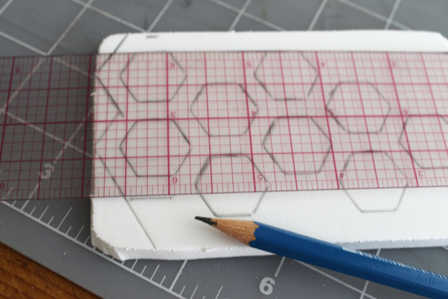 Затем, используя шаблон шестиугольника начертить соты на пенопласте как показано на рисунках.